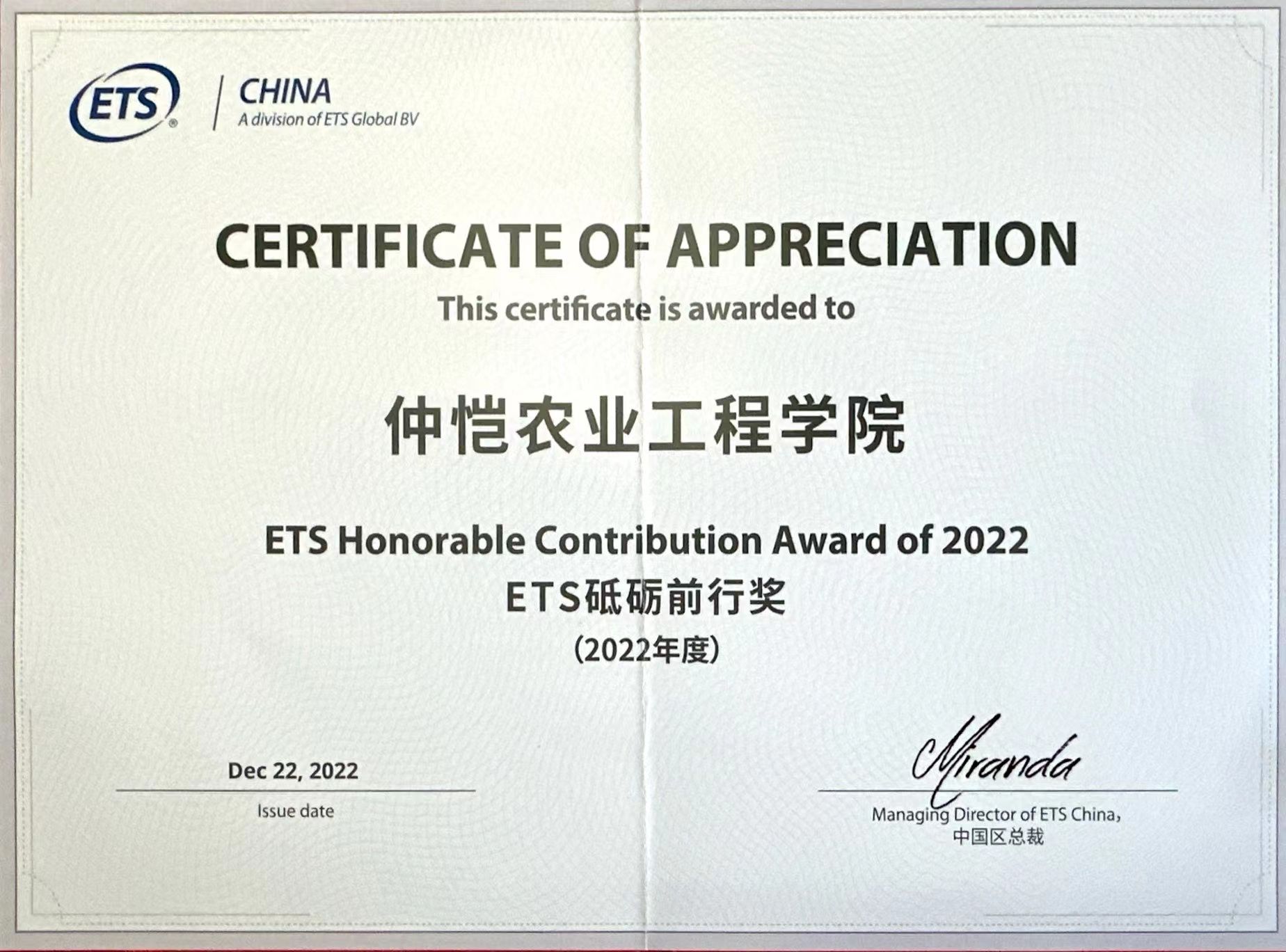 2022年12月22日在美国教育考试服务中心(ETS)举办的全国“2022托福•GRE研讨会”上,公司托福考点荣获该中心授予的全国考点“2022年度 ETS 砥砺前行奖”荣誉称号。